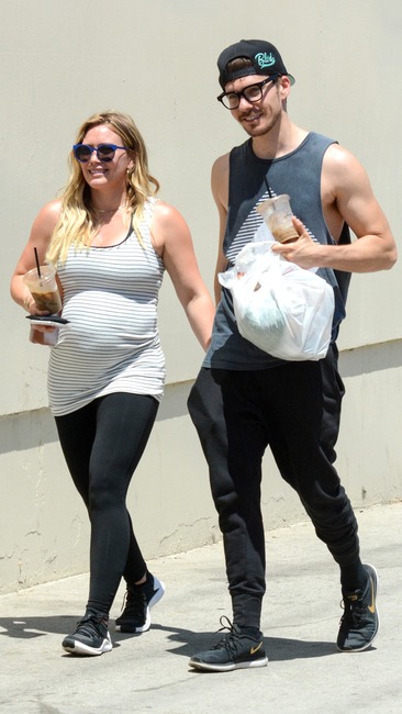 She’s got that pregnancy glow! Hilary rocked a patterned blue maxi dress and matching heels for a coffee run in Los Angeles.