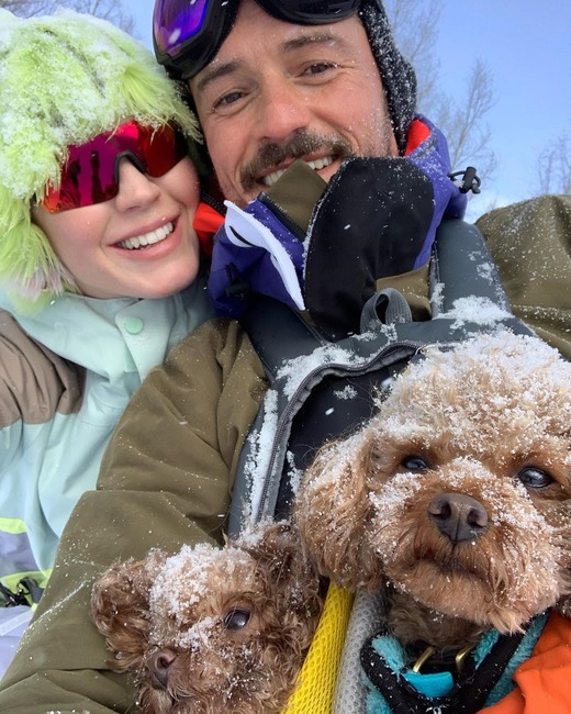 Orlando and Katy give their pups a cuddle as they enjoy a day out in the snow.