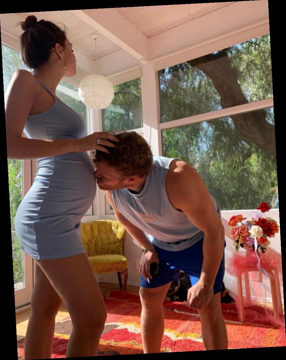 The 29-year-old model and actress, who is expecting her first child with husband Sebastian Bear-McClard, shared a photo of her growing baby bump on Friday. In the adorable image, Ratajkowski wears a form-fitting blue dress while her husband plants a sweet kiss on her stomach.