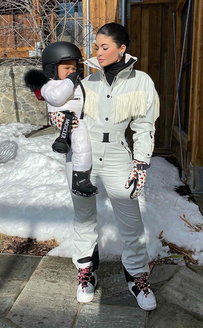 Stormi looked ready to hit the slopes alongside her mama when both wore white ensembles that matching the snow behind them.