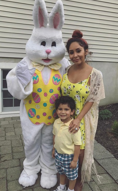Snooki and Lorenzo stopped for a photo with the Easter Bunny.
