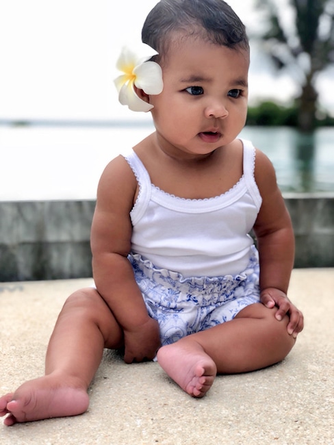 The tiny tike marks her seven month birthday on Friday and we can’t help but gush over the countless photos her mom, Khloe Kardashian, has shared since True came into the world. In a photo exclusively shared with E! News, the little one shows off how well she sits up on her own while on vacation with the Kardashian family in Bali. On the tropical getaway she wore a white tank top, patterned blue shorts and a delicate white flower in her growing locks.