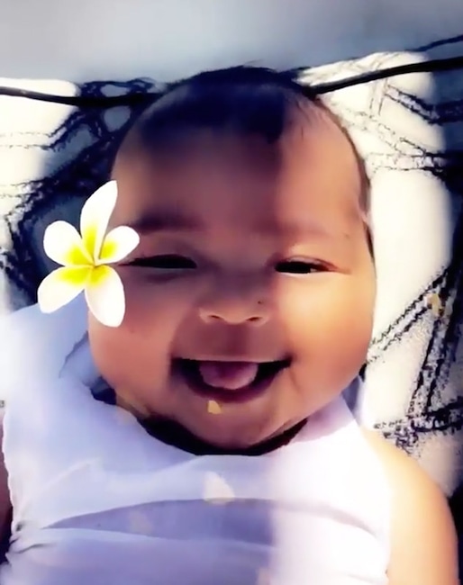 The then-six-month-old rocked a white plumeria in her growing locks while on vacation in Bali with the Kardashian family.
