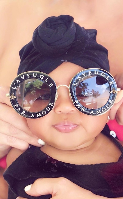 True took advantage of the sunny weather and got glam with a pair of Gucci sunglasses. The phrase translates from French to “blind for love.”