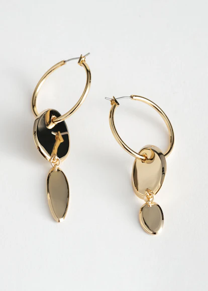 Can’t choose between silver or gold earrings? This pair lets you wear both. An amoeba-like charm hangs from standard hoops, and honestly the shapes are a match made in heaven.