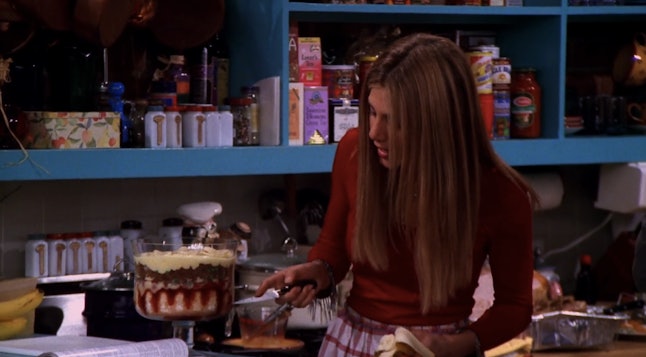Monica and Ross’ parents come over for Thanksgiving dinner without knowing that Monica and Chandler are dating and living together. But more importantly, Rachel makes a trifle for Thanksgiving dessert and puts a layer of beef in it by mistake.