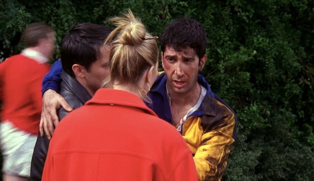 In another Thanksgiving episode, everyone decides to play football in really ’90s workout clothes, and Ross and Monica get way too into it.