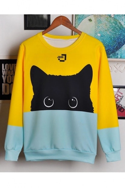 Lovely Cat Printed Color Block Long Sleeve Round Neck Pullover Sweatshirt