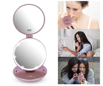 This small travel mirror is the perfect accessory for cosmetic touchups — or even a full makeup application — when you’re out and about. The set comes with one standard mirror and one mirror providing 10 times the normal magnification. While the mirror is light enough to hold, the stable construction means you can also place it on any surface to use it hands-free. Plus, there’s a lighting option — simply slide the power button on and you can get decent light no matter where you are.