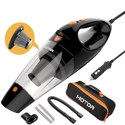 Thanks to a 16.4 foot cord, this car vacuum couldn’t be more convenient or flexible. It features a high-efficiency filter made from a durable stainless steel material, and it even has an LED lamp for when you’re vacuuming at night. The vacuum is capable of sucking up anything from food remnants to pet dander and dust. It also comes with multiple attachments to tackle those frustrating cracks and crevices, including a slim nozzle, an extended tube, and a powerful brush for dirt that gets stuck in the car’s carpet.