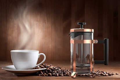 With the choice between 12 ounces or 34 ounces, this rose gold French press coffee maker is made from a strong borosilicate glass that can handle extremely high temperatures, while also being resistant to stains and odors. The glass carafe is surrounded by a strong frame made of stainless steel, as well as a handle that protects you from getting burnt. During the brewing process with this device, the water and coffee are infused for a longer period of time, which results in a cup that’s full of a stronger flavor and a richer scent.