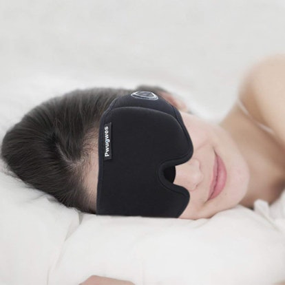 Made from a polyester fabric that’s gentle on your skin, this sleep mask has a 3-D contoured design that puts zero pressure on your eyes while you’re resting. It’s also super breathable, due to the small airways on each side of the mask that provide excellent ventilation (while keeping dry air away from your eyes and face). The anti-bacterial mask also features two straps that can be adjusted up to two feet for your ideal comfort. It even comes with a bonus set of ear plugs that block out noise for an extra refreshing sleep.