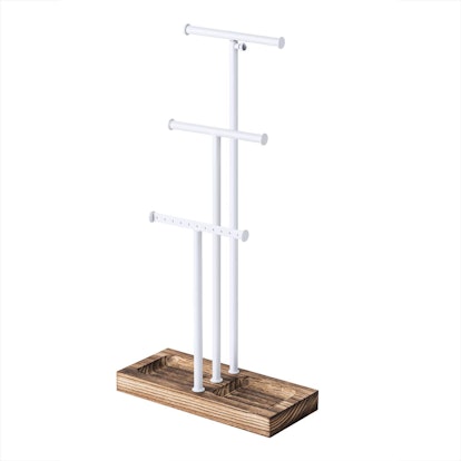 This jewelry tree stand is both a functional and beautiful way to display your favorite accessories. The lowest bar features small holes to hold your earrings, while the third tier can be extended to hold your longest necklaces. The base of the stand also includes two compartments that can hold rings, watches, and other small items. The stand is derived from natural wood and paired with a white-coated metal, and no assembly is required.