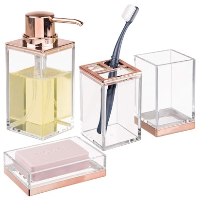 For that extra layer of elegance in your bathroom, this rose gold bathroom accessory set is all you need. It features a toothbrush holder, a soap dish, a soap pump, and a tumbler. In addition to the rose gold design, you can also choose from three other color combinations: black and brushed, clear and brushed, or white and brushed.