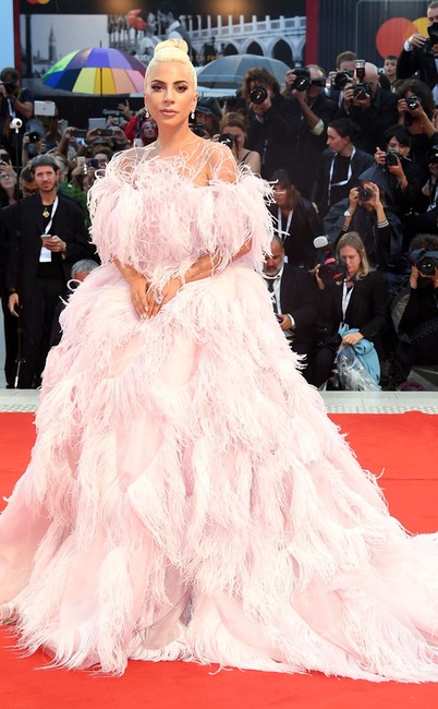 While promoting A Star Is Born, Lady Gaga turns heads at the prestigious event in a blush feathered gown by Valentino.