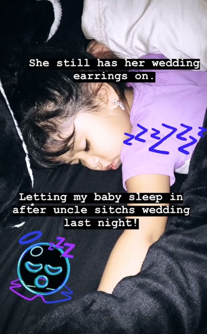 “Letting my baby sleep in after uncle sitchs wedding last night!” Snooki captioned the social media snap.