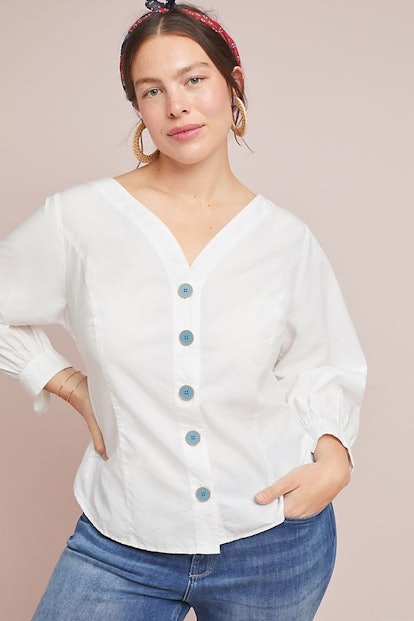 A plain white blouse but better, thanks to blue buttons and balloon sleeves.