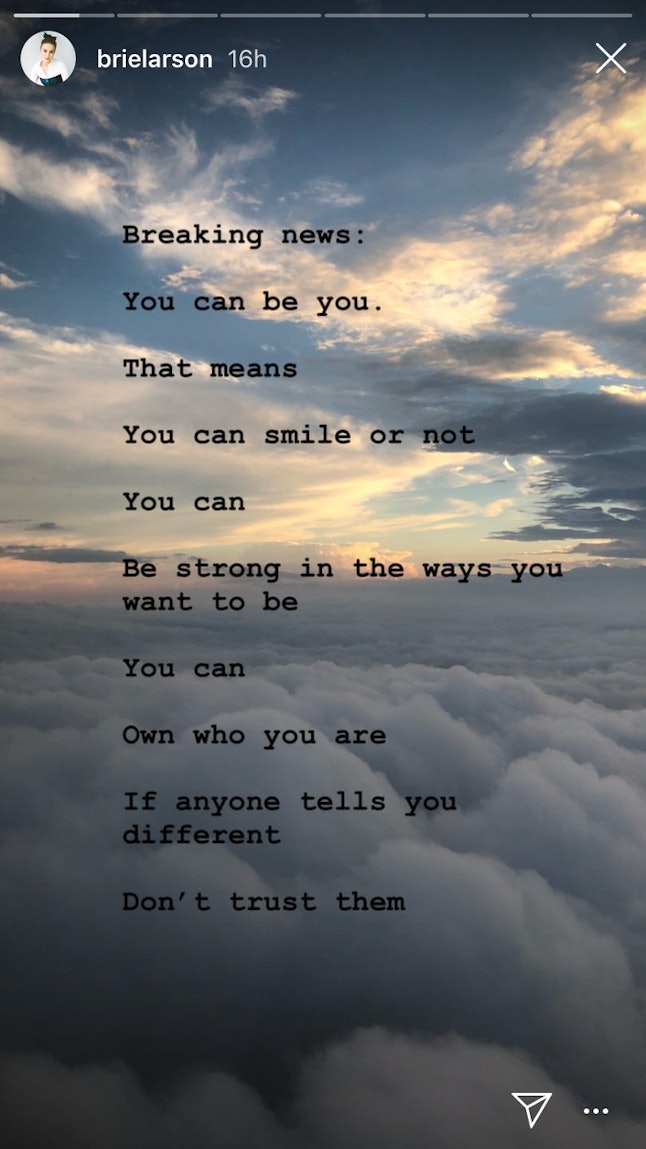Fortunately, Larson wasn’t too affected by the shenanigans. The actor added a few photos to her Instagram story in reference to it that indicated she took it all in stride. The actor shared a few of the male Avengers squad with their cheesy, photoshopped smiles. And she also shared a message to her fans, telling them that they don’t have to smile. "Breaking news: You can be you. That means you can smile or not," she wrote in part.
