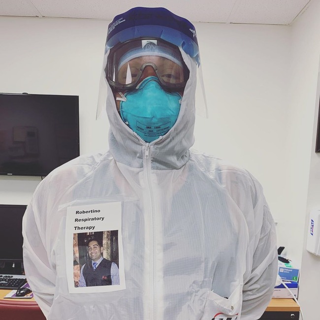 Yesterday I felt bad for my patients in ER when I would come in the room with my face covered in PPE,” Robertino wrote on Instagram. “A reassuring smile makes a big difference to a scared patient. So today I made a giant laminated badge for my PPE. So my patients can see a reassuring and comforting smile.”
