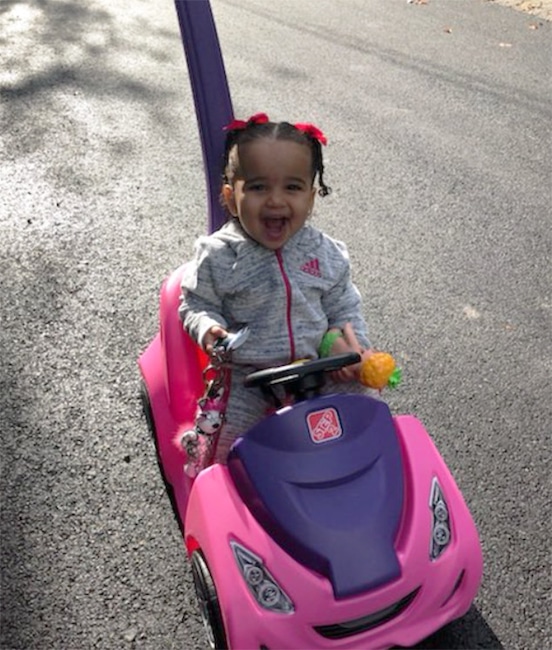 Little Dream hits the road in her pink toy car.