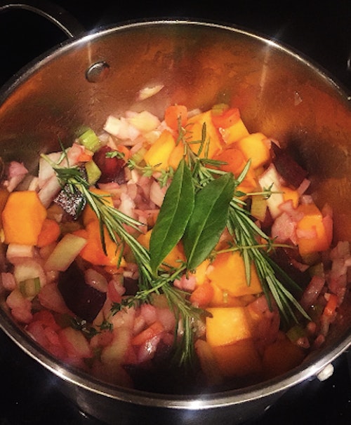 The Nomato sauce takes about an hour to make from prep to completion. The most time-consuming part of this recipe is boiling all of the veggies so they’re soft enough to blend into a liquid. To start, you sauté onions, garlic, carrots, celery, beets, and butternut squash for about five minutes. The beets and butternut squash serve as a the biggest flavor contributors and are also used to make the color similar to that of tomato sauce, but without the acidity of tomatoes. You add in some rosemary and thyme sprigs and bay leaves, and it’s a truly Instagram-worthy sight.