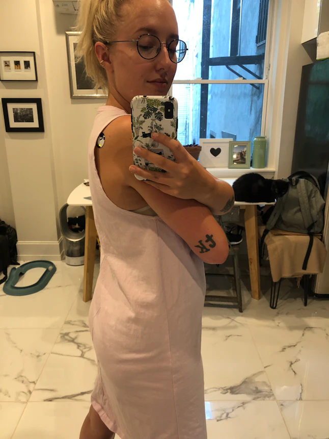 One major thing I learned from this experiment is that taking a photo of something on your own back is quite difficult. Still, here you can see the sticker poking out of my dress on my left shoulder blade, one of the spots the brand recommends sticking them.