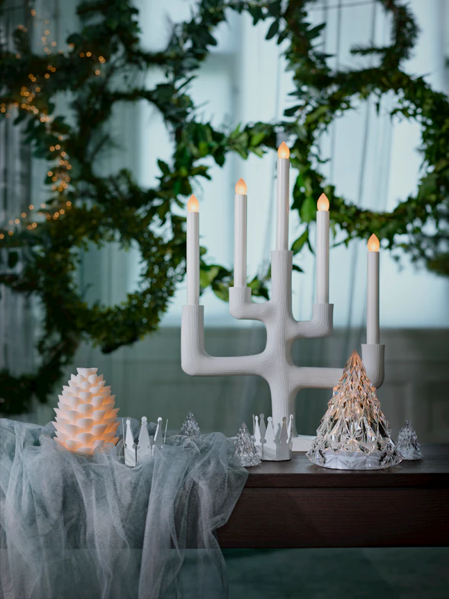 In many ways, the collection puts a modern spin on classic holiday and winter decor. The new products include festive wreaths, gift wrap available in a kaleidoscope of colors and patterns, warm-toned fairy lights, baubles, LED pinecones, candelabras, and tin-canned candles. The decoration collection also features a kitschy and cute variety of woodland-inspired decorations — such as mini mushrooms, pine trees, a paper squirrel wreath, and hanging hedgehogs and rabbits. Basically, IKEA’s new collection will transform your home or apartment into serene winter retreat for you, your family, and friends.