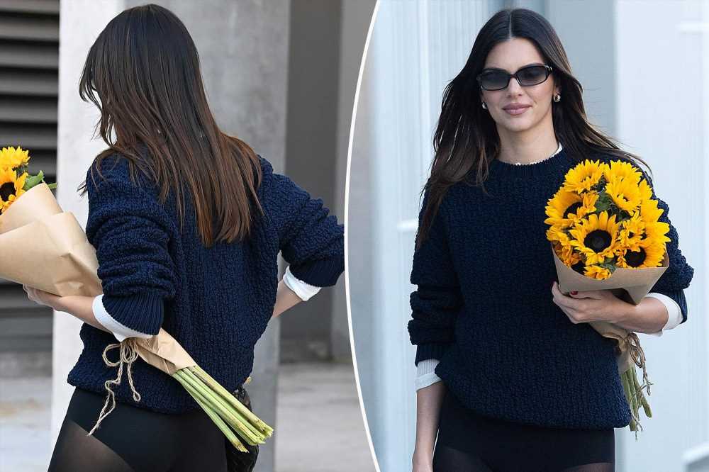 The “Kardashians” star accessorized with a black Bottega Veneta “Sardine” bag ($4,200) with a gold bar handle, adding black slingback heels by the brand and a pair of dark shades as she carried a bundle of sunflowers wrapped in brown paper.