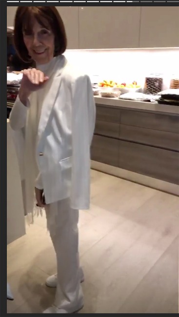 The famous grandmother gives the camera a wave and looks gorgeous in a white suit.