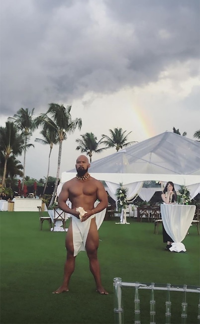 The Hawaiian-themed wedding featured attendants in native Hawaiian outfits.
