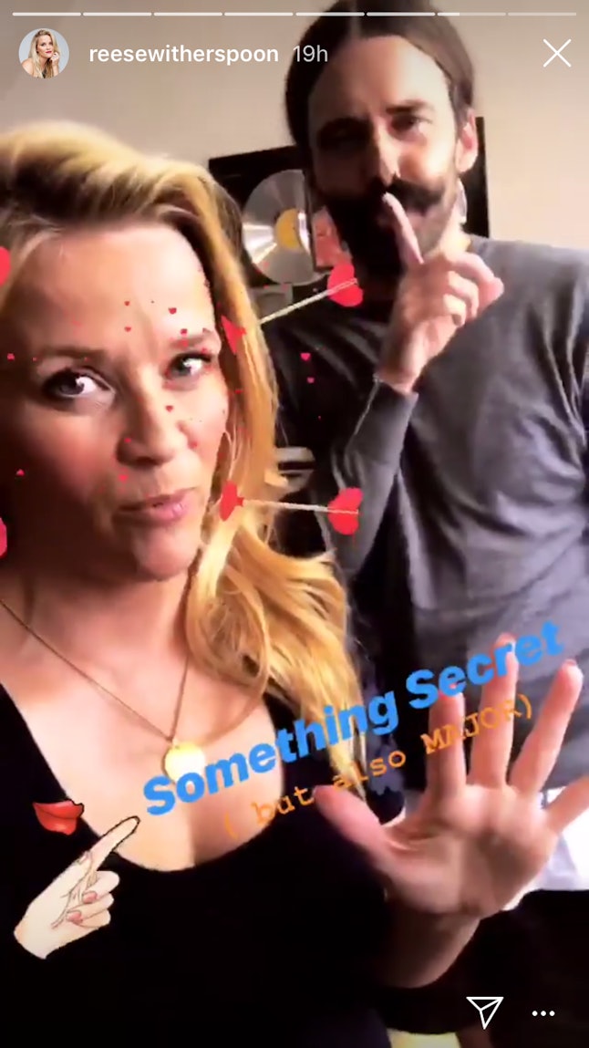 In the next story, both still very hyped up about whatever they’re working on. With yet another interactive filter, this time with hearts, Witherspoon said, "Really excited. We’re doing something, but it’s quiet, like we can’t tell people, right?" While they’re shushing each other, it’s hard not to want to be in that room and be in on their secret. What could it be? There’s an album on the wall, but according to the two celebs, it doesn’t have to do with music. Or does it?