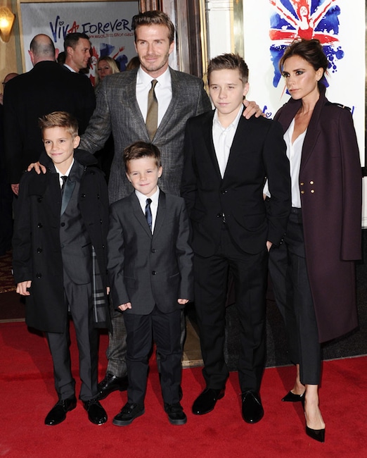 The family of five looked camera-ready for press night of the Spice Girls‘ Viva Forever: The Musical at Piccadilly Theatre in December 2012. Victoria donned separate pieces from her collection, while her boys sported carefully coordinated Burberry suits.