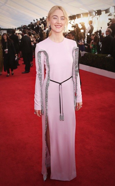 The Lady Bird actress was a showstopper in a long-sleeved pink Louis Vuitton dress with metallic detailing. She completed the look with Christian Louboutin heels and Cartier jewelry.