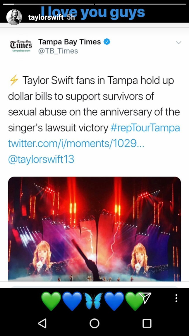 After her statement, People reported that many fans in the audience held up $1 bills. The dollar symbolizes the amount of money that Swift won from the trial. Swift has incorporated the dollar into her work as it was in the music video for the song she released just 10 days after the trial, "Look What You Made Me Do." As Tampa Bay Times reported, fans had been orchestrating this tribute to Swift’s courtroom victory for a month before the concert. And Swift later thanked those who participated in an Instagram Story where she wrote, "I love you guys."