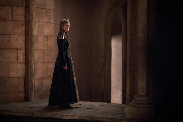 Winter is here, it’s cold, so Cersei also needs a new dress and warm overlay. But the gold chains hanging across the jacket give a small hint of the former Lannister gold and red motif she abandoned the last two seasons.