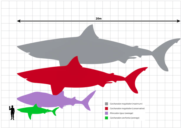 In Jaws, the movie that launched a thousand beach-related phobias, police chief Martin Brody utters the famous line, "we’re gonna need a bigger boat" on finally catching a glimpse of the great white shark that’s terrorized his town. Great white sharks are, on average, 14 feet in length. If Brody caught a glimpse of Carcharocles megalodon, he’d probably want an ocean liner just to be safe. From fossil records, megalodons were thought to be, at a very conservative guess, 16 to 18 meters (53 to 60 feet) long, with some fossil records indicating they could grow up to 24 to 25 meters (79 to 82 feet) in length. Here’s a picture for scale: