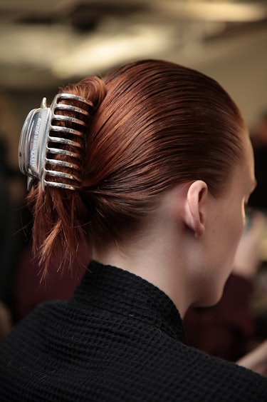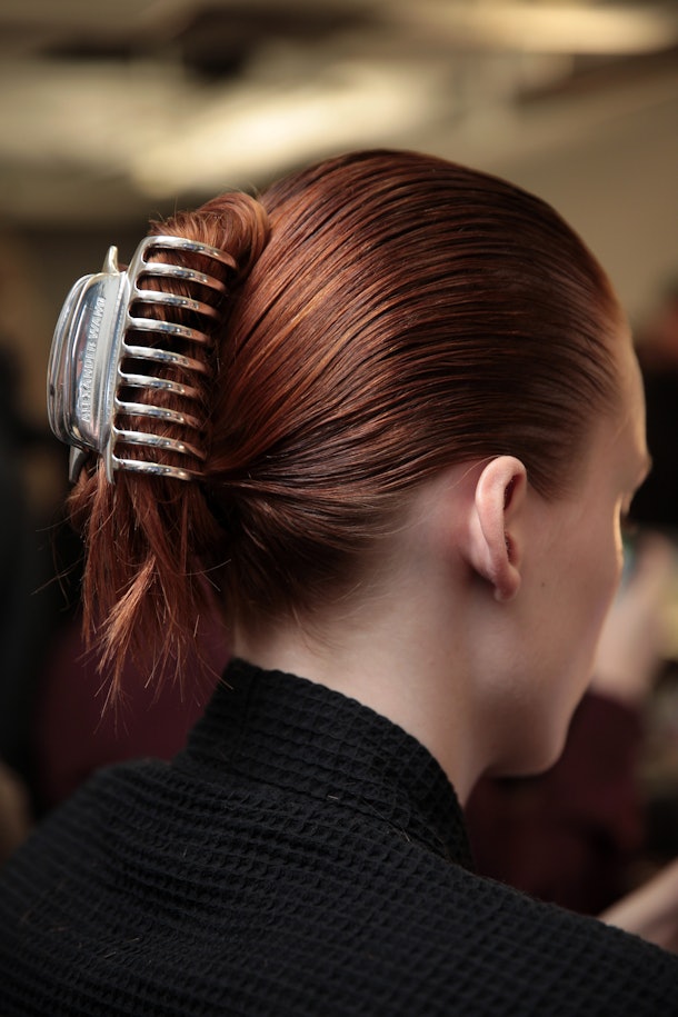 For his AW18 show during New York Fashion Week, Alexander Wang officially gave the jaw clip a major comeback when he had lead hairstylist and Redken creative director Guido Palau slick back the models’ hair into twists at the nape of the neck and secure the hair with jaw clips. Of course, in true Wang fashion, the jaw clips used in his show (which you can buy below for just $24) are much chicer than the plastic, tortoise shell clips you can pick up from your local drugstore. Instead, Wang’s jaw clips are sleek, silver, metal-plated, and adorned with the "ALEXANDER WANG" logo.