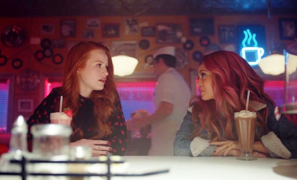 The scene that finally created Choni was a vulnerable, romantic talk at Pop’s Diner. This scene is iconic for all fans of the couple, and you can easily recreate the looks. Unfortunately, the exact Valentino heart-print sweater that Cheryl wears in the scene goes for over $300, which is pretty steep for a Halloween costume. But you can replace it with Cheryl’s cherry-print sweater that looks very similar and saves you hundreds of dollars. Complete the costume with a couple of milkshakes.