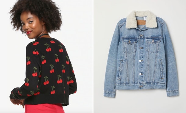 Riverdale Intarsia Cherries Cardigan ($27.92 at Hot Topic), Pile-Collar Denim Jacket ($39.99 at H&M)