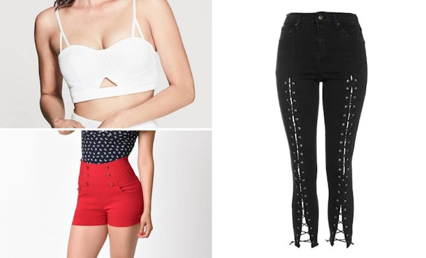 Samira Bra Top ($39.20 at Guess), Red High Waist Sailor Shorts ($28 at Unique Vintage), MOTO Front Lace Jamie Jeans ($20 at Topshop)