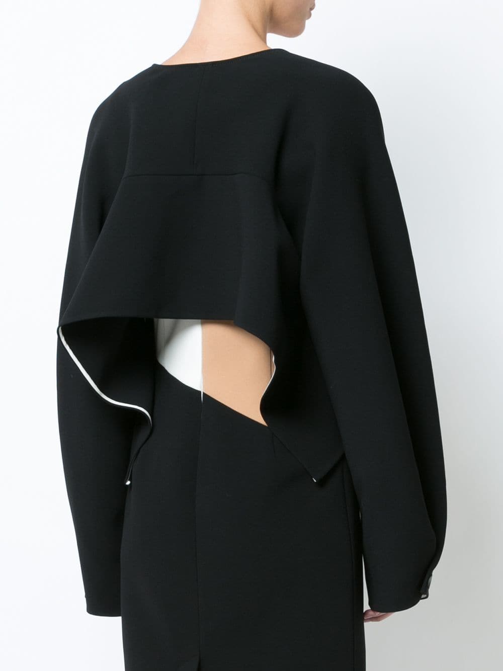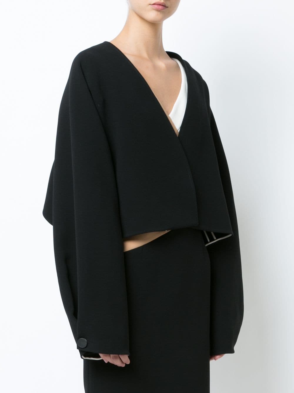When we came across the Diane von Furstenberg Crop Button Jacket, we knew we had to share it with you! The cropped jacket boasts a stunning minimalistic design. There’s a single button for closure and buttons at the cuffs. The style is cropped and has a modestly low cut V-neck, so whatever you’re wearing underneath will stick out. It has extra long sleeves (if you like burying your hands, this is key), and a beautifully draped back. It only comes in one color — black — but has a contrast white trim that lends a fashion-forward touch.