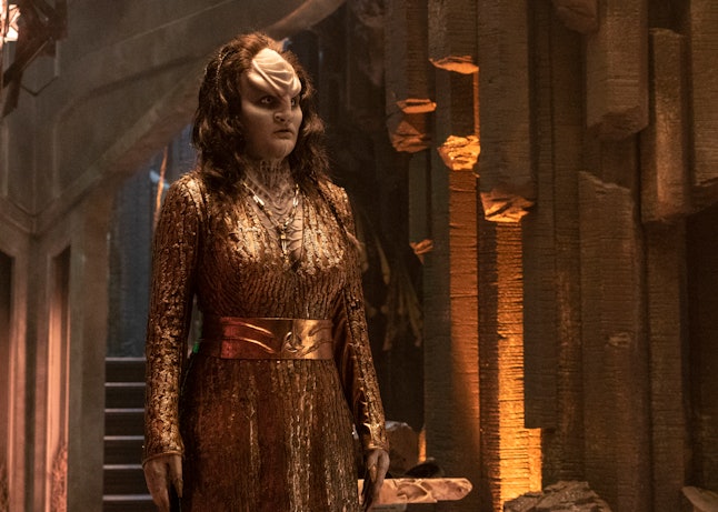 For Mary Chieffo, who plays Klingon Chancellor L’Rell, Discovery’s embrace of gender equality allows her to explore some of history’s forgotten female leaders. Playing arguably the franchise’s most prominent female Klingon, Chieffo has a lot resting on her shoulders, and she draws inspiration from feminist history. "Last year it was the Greeks, Antigone and Medea, and now there’s this element of Queen Elizabeth. Hatshepsut was this female pharaoh who had all of her images destroyed. She had kind of embodied a certain male image at the time of her rule," Chieffo says of L’Rell’s inspirations.