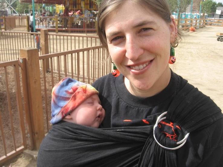 She has said that by using this method, parents get to be hands-free without the added expense of strollers and car seat carriers while babies get their natural need met and can bond more deeply with their parents. As an added bonus, Mayim has also said that babies can safely explore (visually) the world around them by being “worn” by their parents.