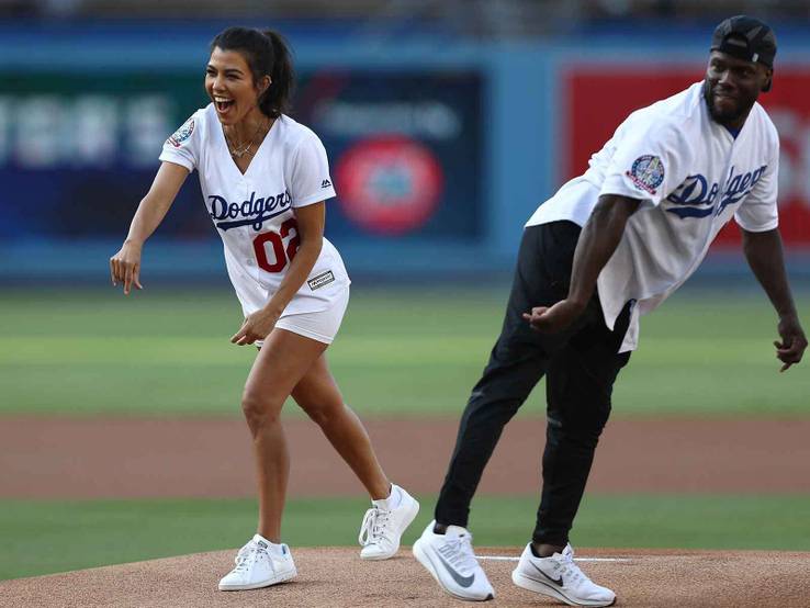 And what a pitch. In 2018, a fresh-faced Kourtney was photographed with Kevin Hart throwing the first pitch at the Los Angeles Dodgers game. Kevin was already at the stadium to film an episode of his TV show. Kourtney is clearly a good enough athlete to be invited to do the honors. Celebrities tend to rock up to games in Versace bags and heels. Not Kourtney. She had her hair back, her best foot forward, and we’ll assume that a return invite is pending.