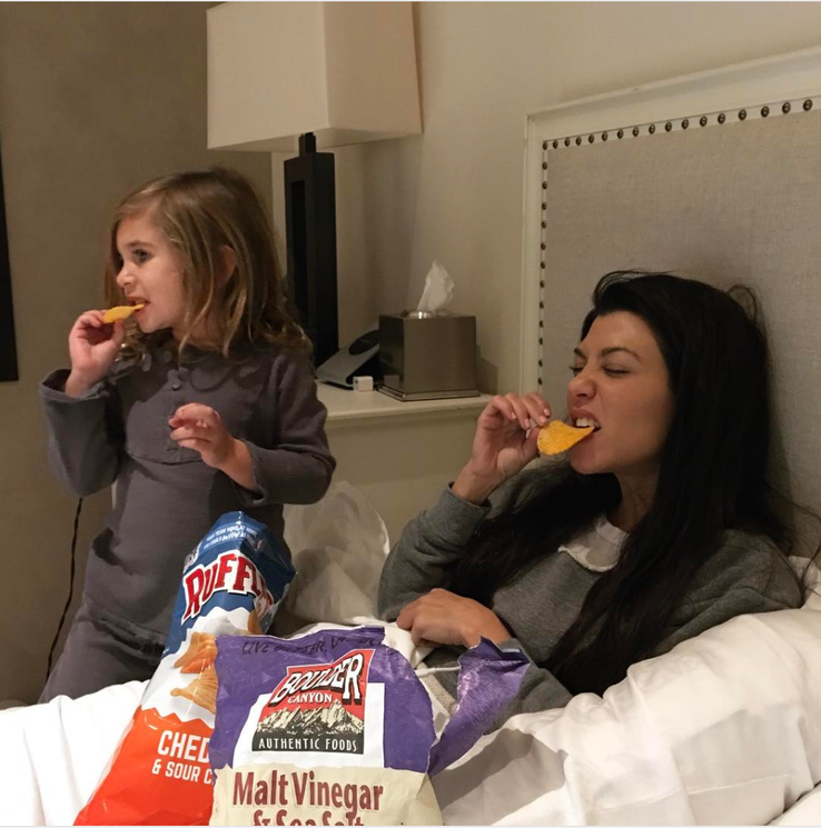 Kourtney has made a fair few headlines with her alternative dietary regimes. Her fear of microwaves and chemicals have been well-documented, as have her gluten-free and non-dairy food choices. Given this awesome bedtime snack pic though, we can assume that food rules don’t apply 100% of the time. Kourt has written on her own blog about noticing the “great positive change” in her kids following the switch away from gluten and dairy. A few Ruffles chips won’t hurt though, right?