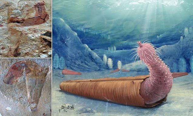 Hermit crabs weren’t the first to call other creatures’ discarded shells their own — fearsome ‘ penis worms ‘ did the same thing 500 million years ago, a study has found. Pictured: an artist’s impression of a priapulid worm squatting in the discarded conical shell of a hyolith