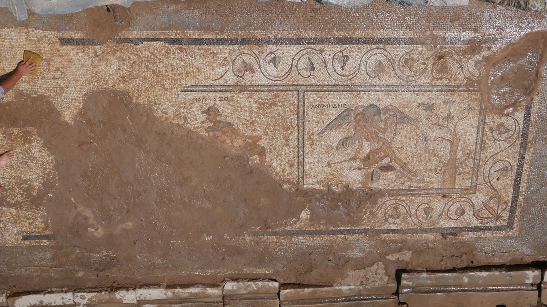 The second-century mosaics, found inside a Roman latrine in Turkey, show scenes that clearly play on myth: Narcissus fascinated with his own phallus and Ganymede getting his genitals sponged clean by a bird.