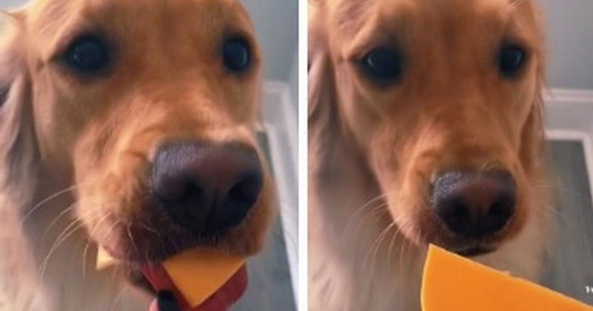 A cheeky golden retriever has gone viral after woofing down a slice of cheese – despite being offered just a bite.