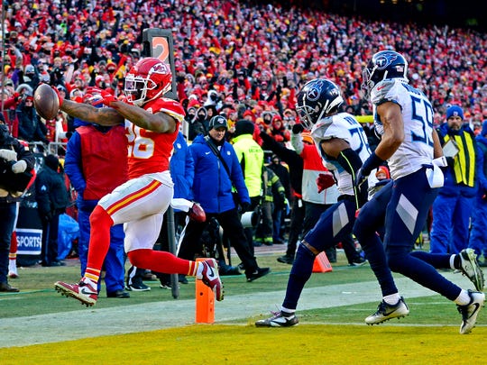 Jan 19, 2020; Kansas City, Missouri, USA; Kansas City Chiefs running back Damien Williams (26) scores a touchdown against Tennessee Titans cornerback Logan Ryan (26) during the third quarter in the AFC Championship Game at Arrowhead Stadium. Mandatory Credit: Jeff Curry-USA TODAY Sports