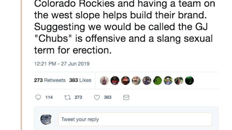 Lummis: In May, the Colorado Rockies did a Twitter contest that was a giveaway of Hartford Yard Goats hats. Seeing this as a perfect opportunity, I again tweeted that it would be cool if the GJ Rockies were the Humpback Chubs and had hats to give away. This is when they blocked me. I honestly was pretty excited about being blocked. I tweeted a screenshot of it and that was when my friends started to tweet at the team and also get blocked. I was a bit annoyed that the team resorted to blocking people instead of interacting with us about the name but I did enjoy the fact that the fact they blocked people seemed to increase the amount people mentioned it to them.